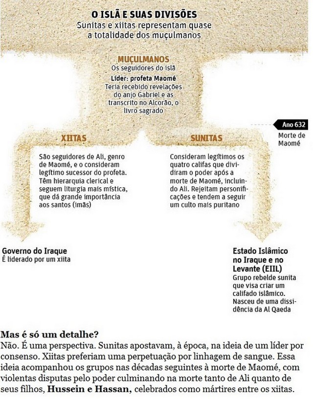 Na escolha de quem daria continuidade à liderança do profeta Maomé, morto em 632. Maomé havia revolucionado a península Arábica com o livro sagrado que recitara (o Corão), superando as relações tribais pela idéia de uma comunidade religiosa, chamada “umma” em árabe. Mas, quando morreu, Maomé não deixou um herdeiro. Parte dos muçulmanos preferiu que o líder da comunidade fosse escolhido entre seus seguidores (esses são os chamados sunitas). Os xiitas são aqueles que preferiram um líder que tivesse laços de sangue com Maomé (especificamente Ali, seu primo e genro). Os sunitas venceram a disputa e elegeram Abu Bakr, primeiro califa do islã.
