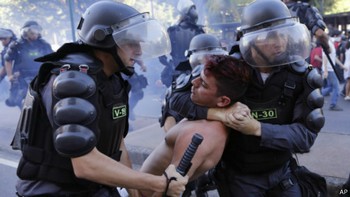 Os protestos até aconteceram durante a Copa, mas em uma escala bem menor do que os de 2013. E os poucos que aconteceram acabaram sendo reprimidos com vigor pela polícia, que tinha como objetivo manter os manifestantes longe do estádios. Principalmente em São Paulo, no dia da abertura, e no Rio de Janeiro, no dia da final, foram registradas ações fortes da policia, deixando feridos e presos.